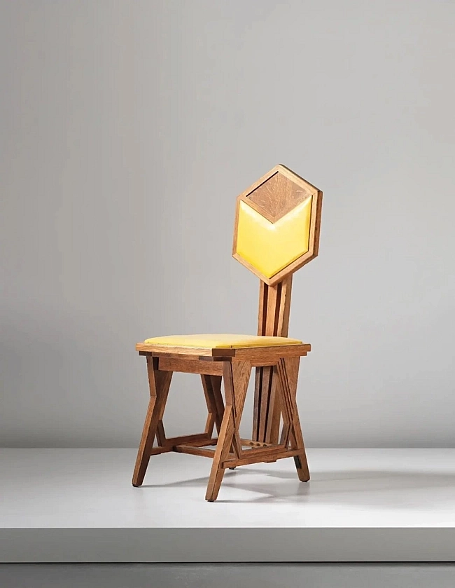Франк Лойд Райт, пионер на органичната архитектура, е американски архитект, който проектира някои от най-емблематичните сгради в света. Едно от най-важните постижения на Райт, столът Peacock, който той проектира за хотел Tokyo Imperial, е архитектурен шедьовър, който демонстрира гения на Райт. Проектиран за Peacock Room на хотела, този емблематичен стол е доказателство за майсторското използване на геометрични форми от Райт. Съставен от шестоъгълна облегалка и геометрични крака, столът има дървена рамка и е тапициран с восъчен плат.